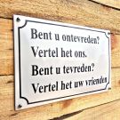 De ovale emailleborden met standaard tekst worden volledig handmatig geproduceerd. Lettertype: schuin. Kleur (ondergrond) is wit. Per kleur in de oven op 800ºC. Basismateriaal 1,5 mm. plaatstaal, gebold van vorm.